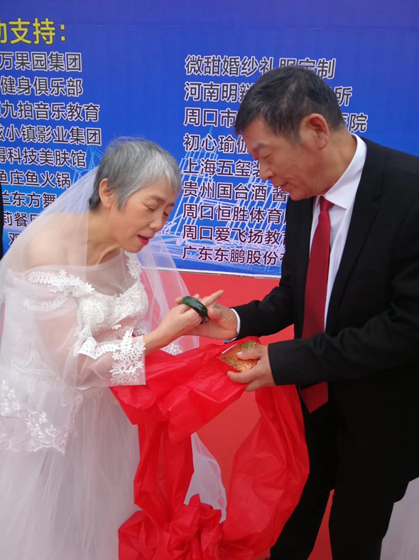 10月19日上午,在周口宏德养老孝道文化节上,18对老人身着盛装参加老年集体婚礼。典礼开始后,18对老人手牵红丝带走上舞台,经过现代式结婚典礼流程后,老人们互赠礼物。老人们非常激动,他们相互拥抱,有的还流下了眼泪。台下的子女也激动万分,纷纷走上舞台与自己的父母拥抱在一起。