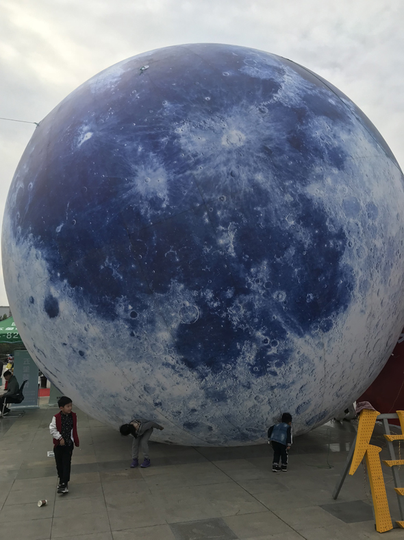 记者在现场看到,这个“大月亮”块头很大,摆放在展厅前。前来参加展会的市民纷纷拍照,有的市民还把它发到微信朋友圈,称“周口有个超级大月球”。