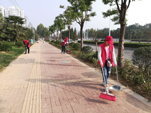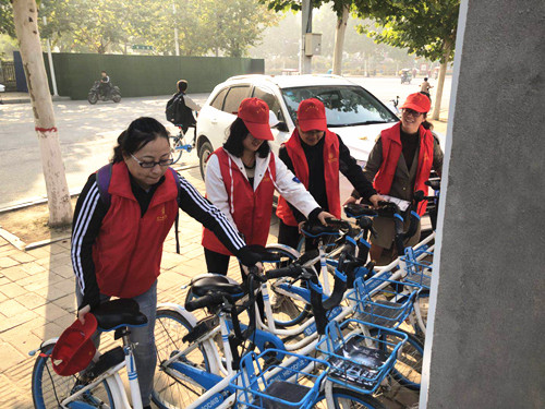 为扎实推进“五城联创”工作深入开展,调动广大市民积极参与“五城联创”工作的积极性、主动性,我市在中心城区开展了为期一个月的“洒扫庭院迎宾客,文明创建我助力”活动。图①为中国人民银行职工在清理小广告。图②为中国人寿职工在清扫路面。图③为市公路局职工在清理绿化带。图④为周口师范学院师生在整理共享单车。