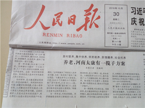 为助力脱贫攻坚,有效提高农村特困老人整体供养水平,太康县民政局、县扶贫办等部门在县委、县政府正确领导下,按照“一户一策、一人一法”原则,创新实施集中供养、亲情赡养、社会托养、居村联养、邻里助养“五养”模式,有效破解了特困老人的脱贫和养老难题。该做法经《周口日报》率先报道后,国家级、省级媒体纷纷慕名前往太康采访。截至目前,百余家媒体或网站相继报道了太康“五养”模式。10月30日,《人民日报》《光明日报》分别以《养老,河南太康有了一揽子方案》《河南太康:“五养”模式破解特困人员养老难题》为题重磅介绍了太康“五养”模式经验。10月30日,人民日报海外版官方网站还以《河南太康:“五养”模式来了 特困人员笑了》为题作了报道。据了解,国家级3家主流媒体同一天内报道同一工作经验,在太康县宣传史上尚属首次。