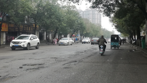 11月8日,记者现场采访发现,中州大道和人和街交叉口以北路段,路面沥青剥离脱落、布满大大小小的坑,碎石子散落满地,车辆经过时,都不得不减速绕行。