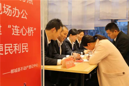 11月10日至13日,郸城县不动产登记中心紧紧围绕“服务群众、服务民生”,用钉钉子的精神,苦练绣花功夫,创新服务方式,主动贴近服务,擦亮“小窗口”,进驻刚开盘的楼盘,积极搭建起便民利民“连心桥”,真正做到让信息多跑路、让群众少跑路,实现了“流程顺畅、高效便捷、群众满意”的业务办理,受到了办事群众和企业的高度称赞。