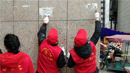 当日下午,气温明显偏低,“啄木鸟”志愿者们不顾寒风的侵袭,手拿小铲子来到周口市区七一路开展清理工作。只见他们有的用小铲子在墙面上清理,有的用抹布在墙壁上擦拭,还有的往墙面上喷水,配合得十分默契。“这些小广告很烦人,有粘贴在墙上的,也有用油漆、油墨涂写的,给我们的清理工作带来了很大的困难。”清理现场,一位志愿者说,对于一些些粘贴牢固不易清理的小广告,他们只能用手一点一点将其撕掉。