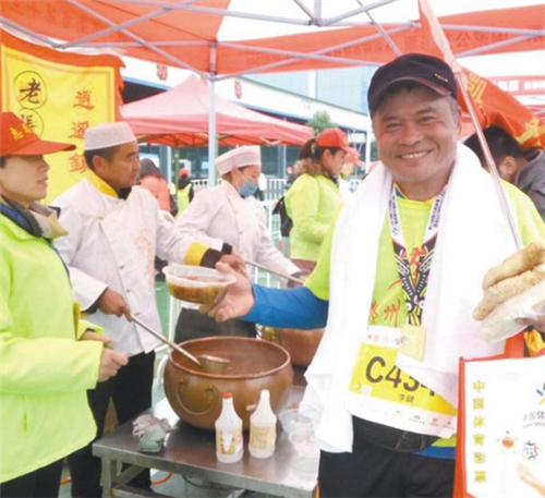 提起周口,“周口胡辣汤”可谓声名在外。此次马拉松赛事,主办方为了让选手品尝到周口香辣可口的胡辣汤,特意将周口4家不同口味的胡辣汤“端”到比赛现场,让很多跑友过了一把胡辣汤瘾。图为参赛选手品尝胡辣汤。记者 张志新 摄
