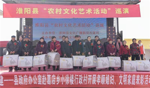 当天,不仅表彰了11名孝顺媳妇、11个文明家庭,赠送了价值3万余元的办公用品、慰问品和各类图书1000余册,还开展了义诊活动。同时,由县政府办公室文艺志愿者、社会义工等共同为广大群众送上了一场文艺盛宴。