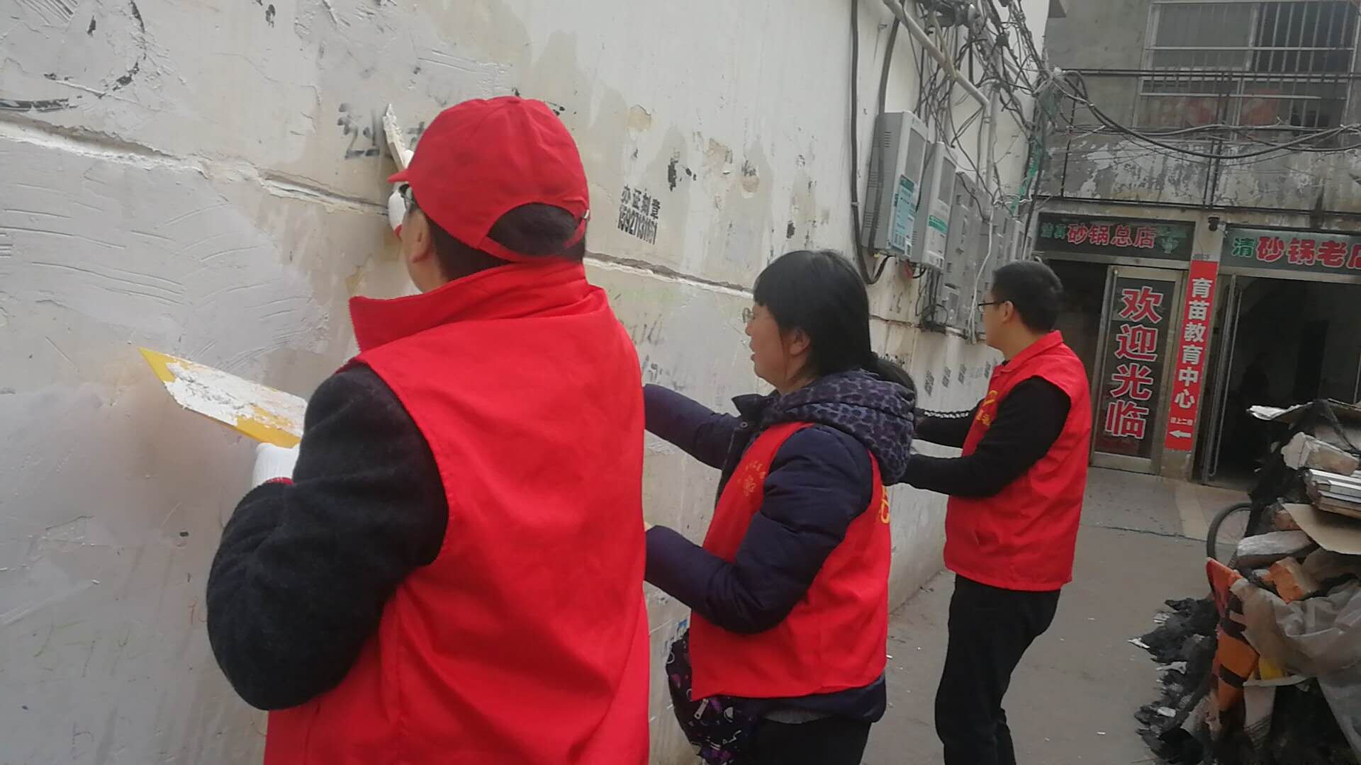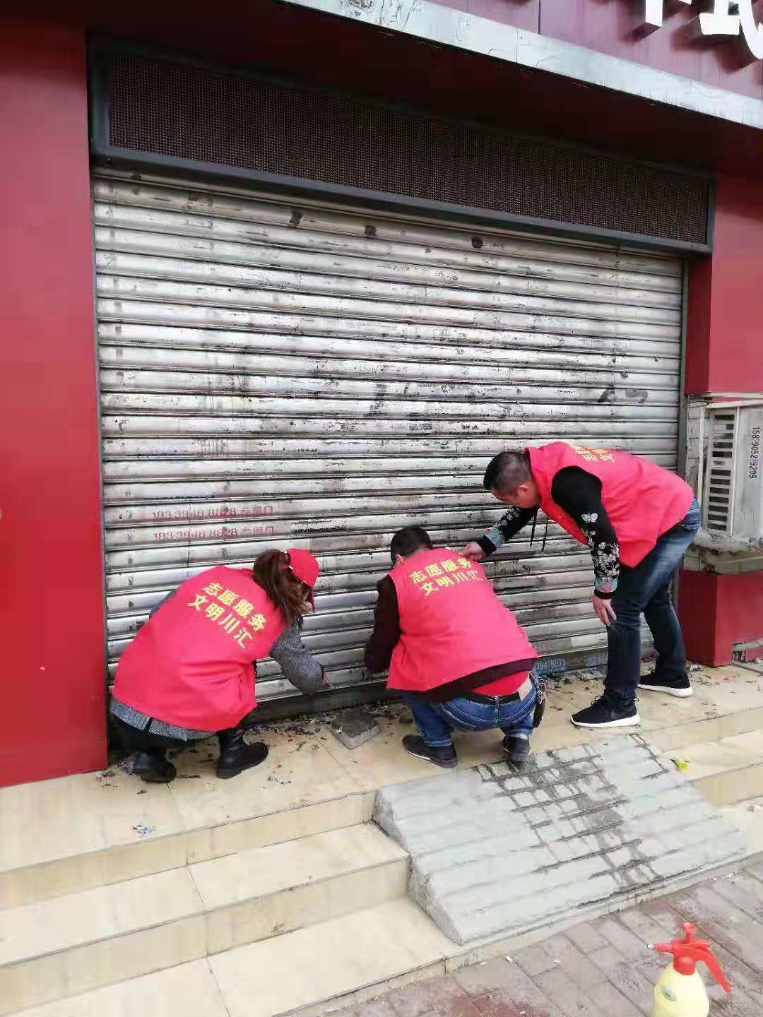 作为城市管理和市容环境整治的“主战场”,川汇区自11月起设立“市容工作日”,进一步深化“五城联创”工作,切实改善中心城区面貌。11月27日,“市容工作日”活动正式启动,川汇区各单位纷纷组织志愿者走上街头,在各自辖区开展小广告清理等环境综合整治工作。图一为志愿者粉刷布满小广告的建筑物外墙。图二为志愿者清理地面上的小广告。图三为志愿者清理卷闸门上的小广告。
