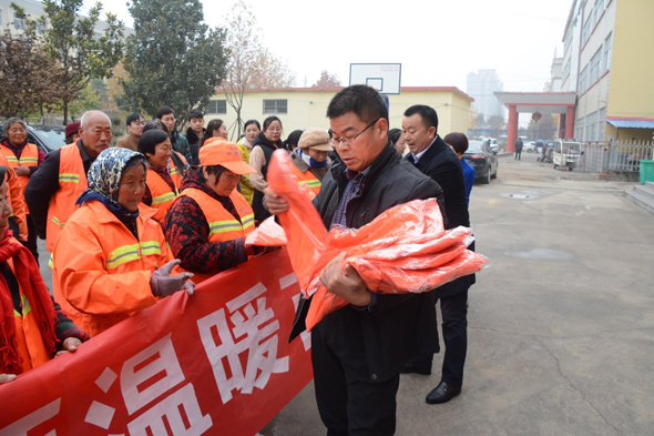 近日寒流来袭,气温骤降,连续的低温降雨天气让人感受到了冬天的寒冷,为了确保县城区环境卫生干净整洁,广大环卫工人们始终坚持冒严寒每天起早贪黑打扫城区卫生,默默无闻坚守在工作一线。12月3日,西华县娲城商会会长黄凤芝携手爱心企业山西汾酒集团代理商宋二领来到城管局向环卫工人捐赠一批环卫保洁防寒服,在寒冷冬天为坚守县城区保洁一线的每位环卫工人送去温暖。