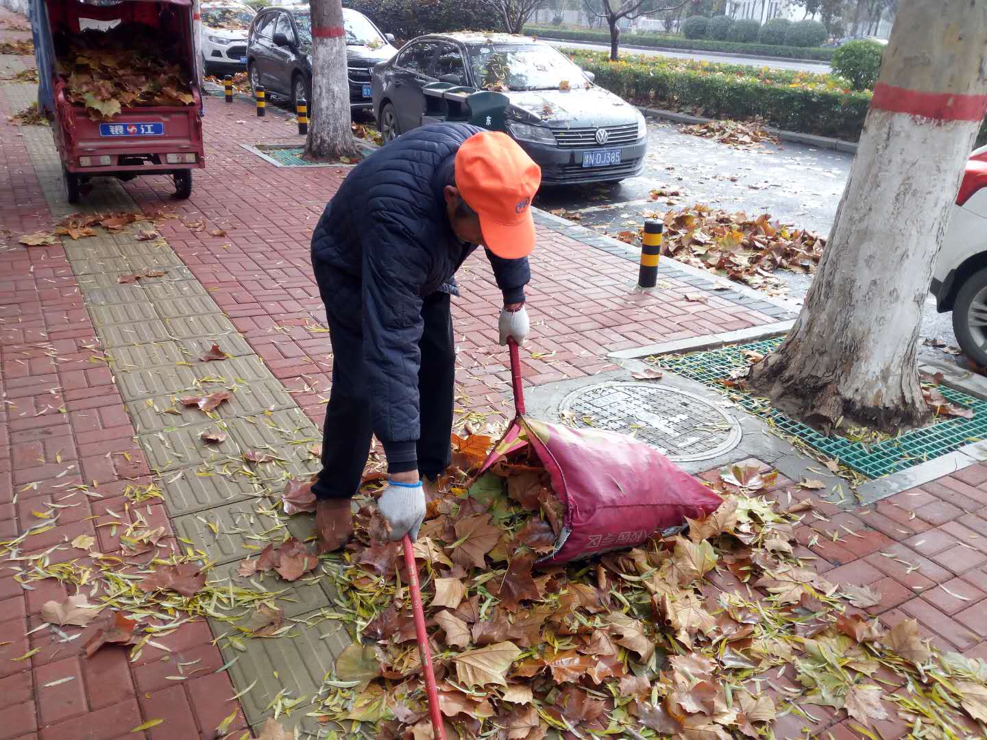 12月3日晚上,周口市中心城区风急雨骤,树叶落了一地。4日上午天放晴,环卫工人纷纷上街清扫落叶。负责兴旺路的环卫工人告诉记者,他以前两个小时就能打扫完,而当天他干了3个小时还没有干完,估计还得再干1个多小时。图为环卫工人在清扫落叶。