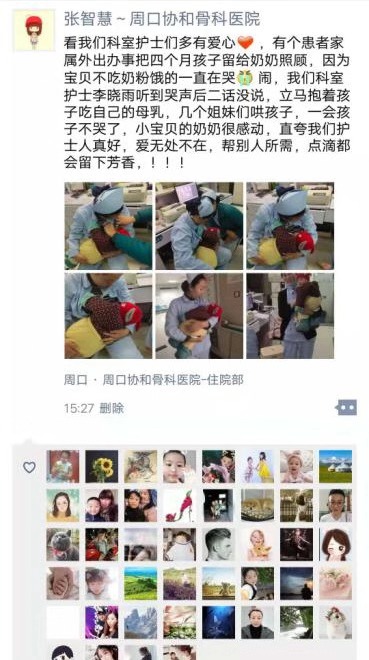 儿子住院,陪护的妈妈临时有事外出,把4个月大的女儿留在病房交给奶奶照顾。熊孩子不知体谅大人,饿了就大哭大闹,死活不吃奶粉,把奶奶难为得要掉泪。12月10日下午,这心酸一幕发生在周口协和骨科医院手外二科病区,但感人一幕也紧接着上演,正在哺乳期的护士李晓雨麻利地把孩子接过来,让孩子在护士站饱饱地吃了一顿。孩子安静了,奶奶却感动得不行,连说:“这闺女,真好!”