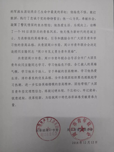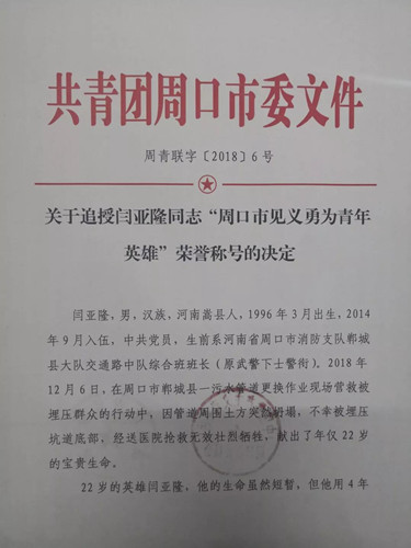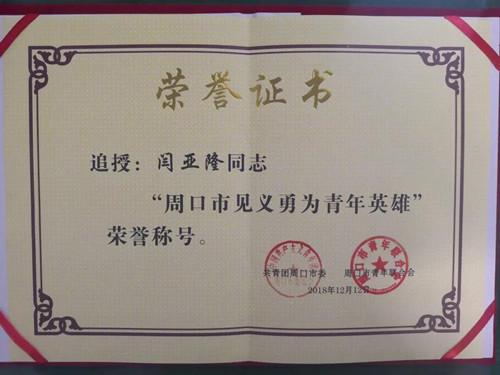 12月13日,记者从郸城县团县委获悉,为表彰闫亚隆同志的英雄事迹,引导和激励全市广大团员青年学习他的崇高品格,共青团周口市委、周口市青年联合会追授闫亚隆同志“周口市见义勇为青年英雄”称号。