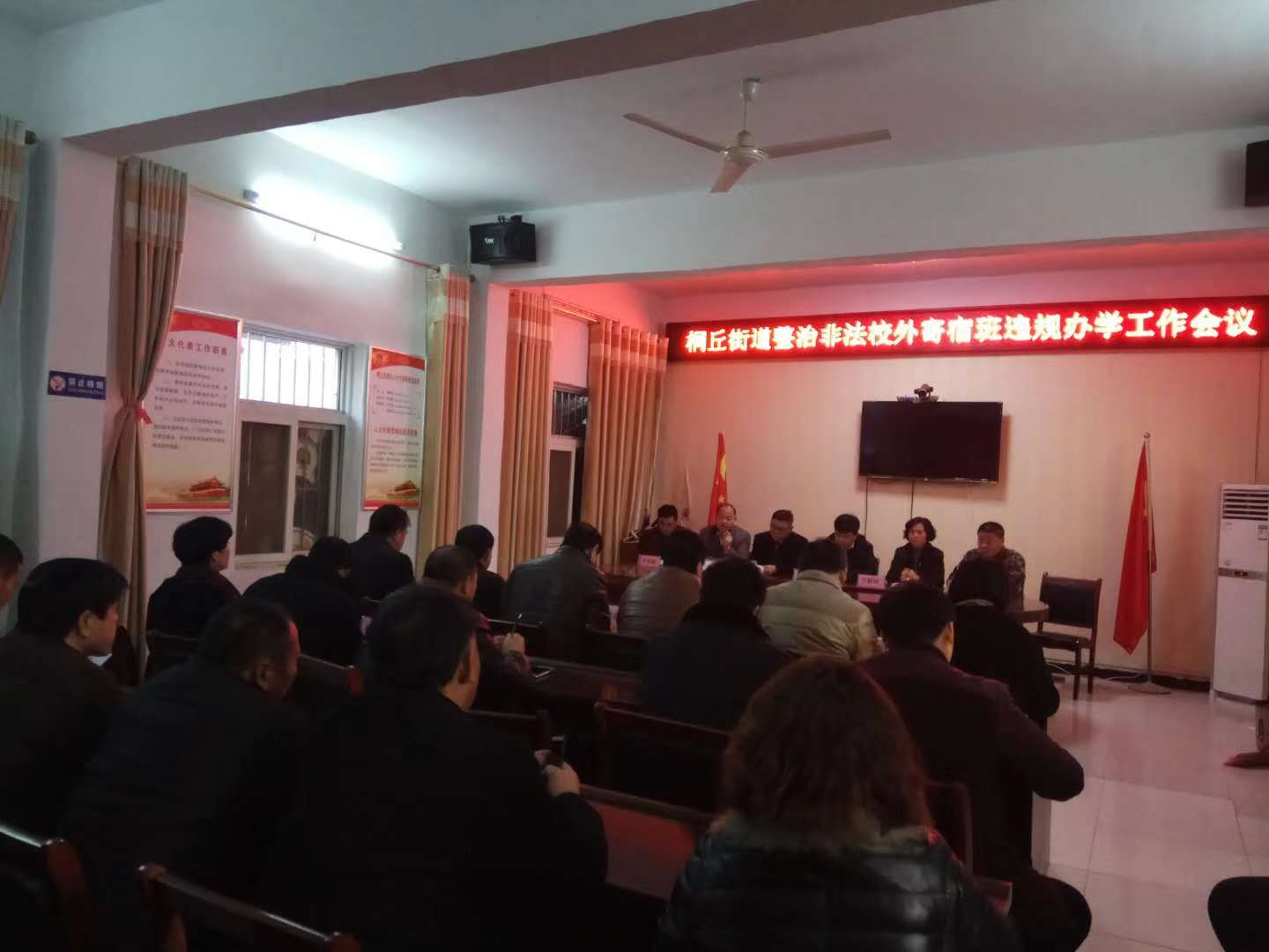 与会人员首先收看了桐丘街道排查非法校外寄宿班安全隐患专题片。县消防大队指导员李广华通报城区非法校外寄宿班情况。县教体局副主任科员李军峰对各中小学开展非法校外寄宿班整治工作提出具体工作要求。桐丘街道党工委书记万群玲对非法校外寄宿班存在的安全隐患进行详细讲解,对红旗小学采取的得力措施表示肯定,并对下步工作作出安排部署。