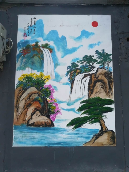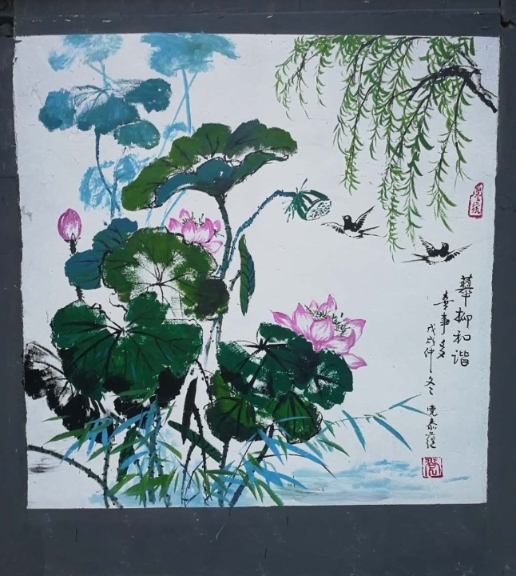 今日,记者在汉阳路看到路边的墙壁上出现了两幅幅美丽的图画,两面墙体如同装裱后的国画,成为一道靓丽的路边风景。这两幅墙绘,一幅题字为“翠柳和谐喜事多”,以翠柳、荷花等中国传统园林特色的植物作为表现主体;另一幅题字为“山青水秀幸福多”,以山水、苍松等为表现主题。
