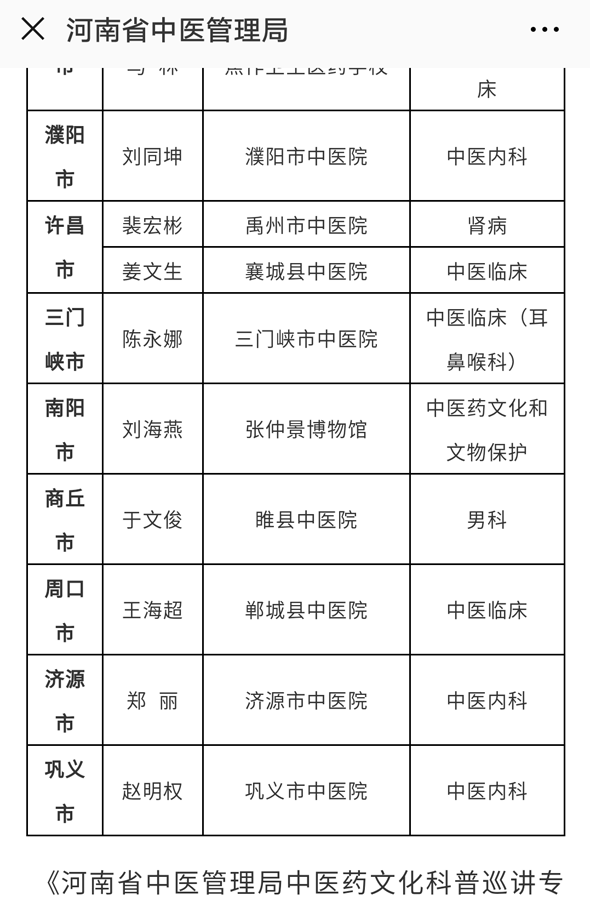 《通知显示》,为加强全省中医药文化科普人才队伍建设,经培训考核,张世卿、王海超等34位同志被遴选为第二批河南省中医药文化科普巡讲专家,聘期三年。