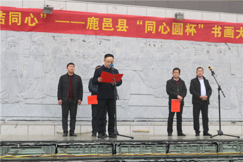 为庆祝改革开放40周年,深入学习习近平新时代中国特色社会主义思想和党的十九大精神, 巩固和发展爱国统一战线,在新时代画好最大同心圆, 团结和带领各族各界人士深入挖掘中华优秀传统文化蕴含的思想观念、人文精神、道德规范,让中华文化展现出永久的魅力和时代风采, 12月20日上午,由中共鹿邑县委统战部主办、县文学艺术界联合会承办、“天地人笔业”协办的鹿邑县“纪念改革开放四十周年·同心圆杯书画大赛” 在城区问道苑广场开展。县委常委、统战部部长闫家明出席开幕式并讲话。县委统战部常务副部长李继良,县文联主席王亚飞,副主席于连河以及本次全体获奖和入展作者,文联所属各协会主席团成员近200人参加开幕式。