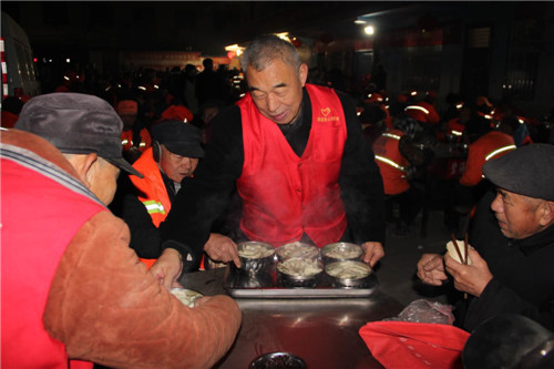 “环卫工人平均年龄都在60岁以上,牙口不好,是‘爱心粥屋’和志愿者给我们精心调制的鸡蛋韭菜馅饺子,味鲜、好吃、正合老年人的口味,感谢党、感谢志愿者不畏寒冷、不怕辛苦给我们端吃端喝,就是在家也没有这么好的待遇。”环卫工人李大娘感激地说。