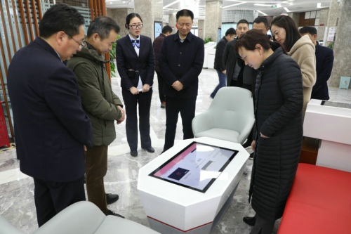 调研组一行首先来到商水农商银行阳城支行查看“普惠+数字”银行建设情况。阳城支行行长简要介绍该网点基本情况、服务理念后,引导调研组一行依次参观了普惠授信服务区、数字智能服务区、电子银行体验区、保管箱服务区、贵金属服务区等特色功能区,并详细介绍了每个功能区的作用和特点。调研组一行现场体验了智能导览台 、客户互动桌等智能设备,对该网点定位准确、理念前卫、设备先进、功能齐全、分区合理,为客户提供全方位的金融服务表示赞赏。