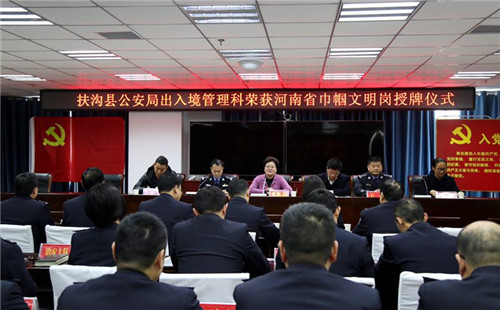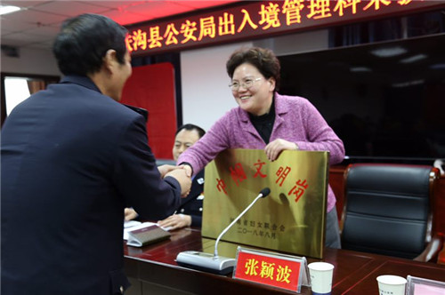 12月26日,扶沟县长张颖波向荣获河南省“巾帼文明岗”的县公安局出入境管理科授牌仪式在县公安局九楼会议室举行。副县长任松奎,县政府党组成员、县公安局局长田豪杰,县公安局政委石伟等出席授牌仪式。