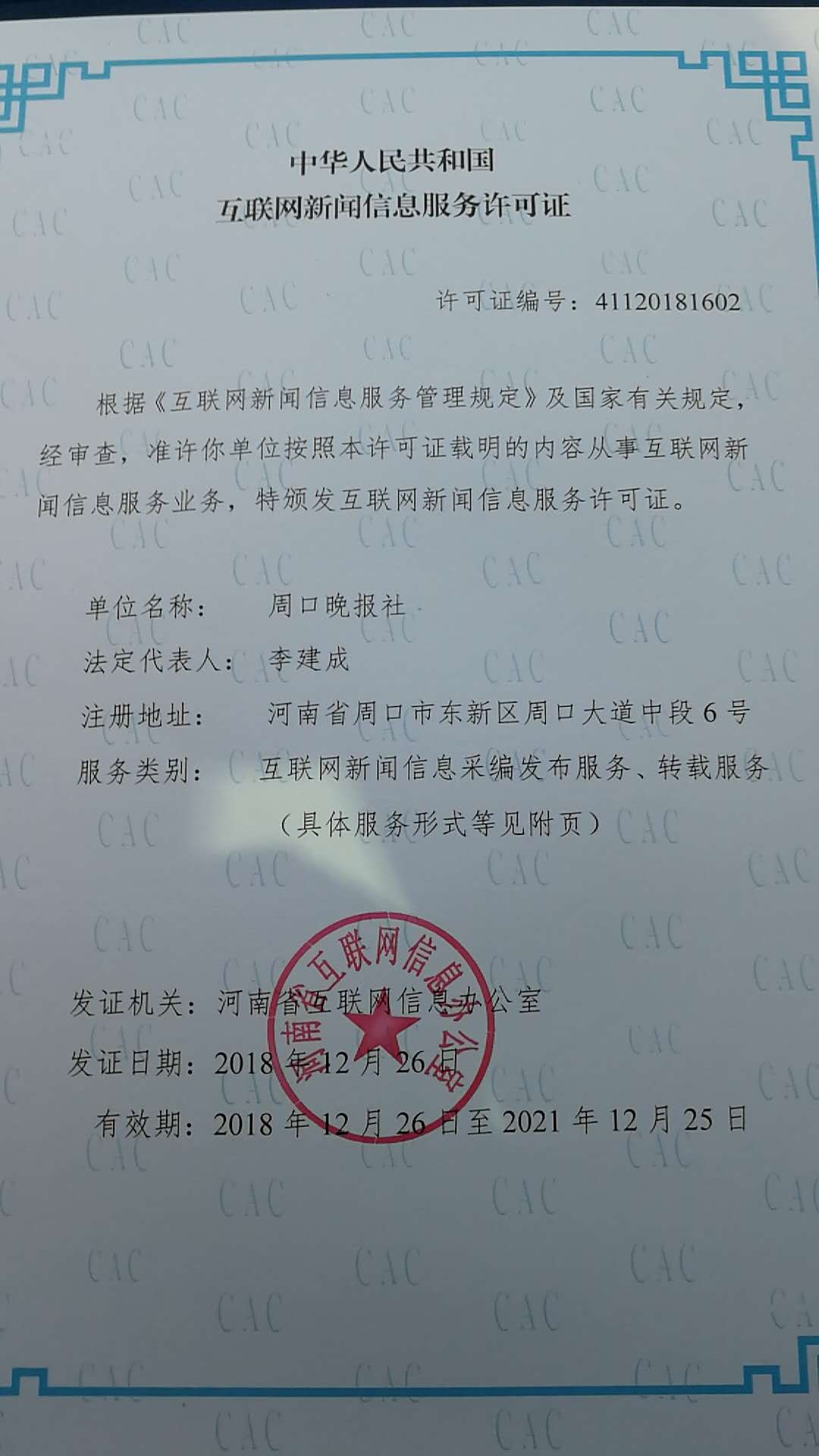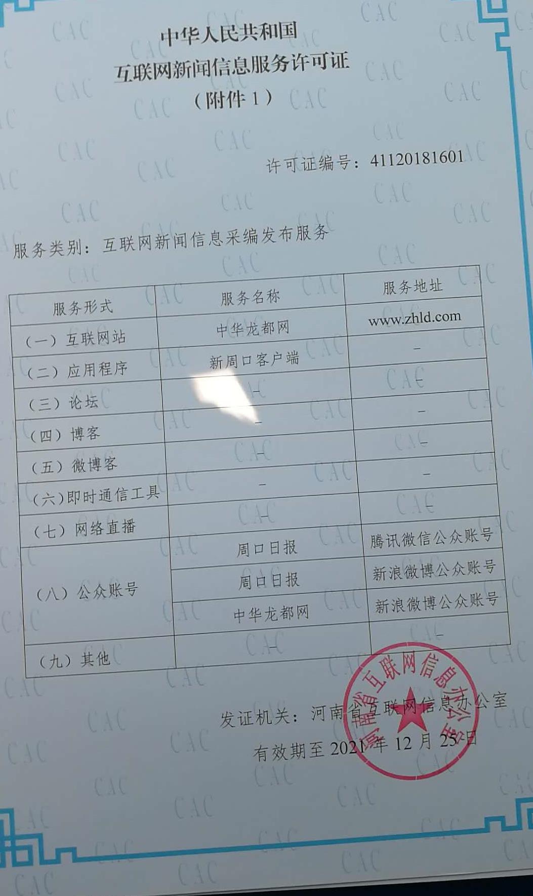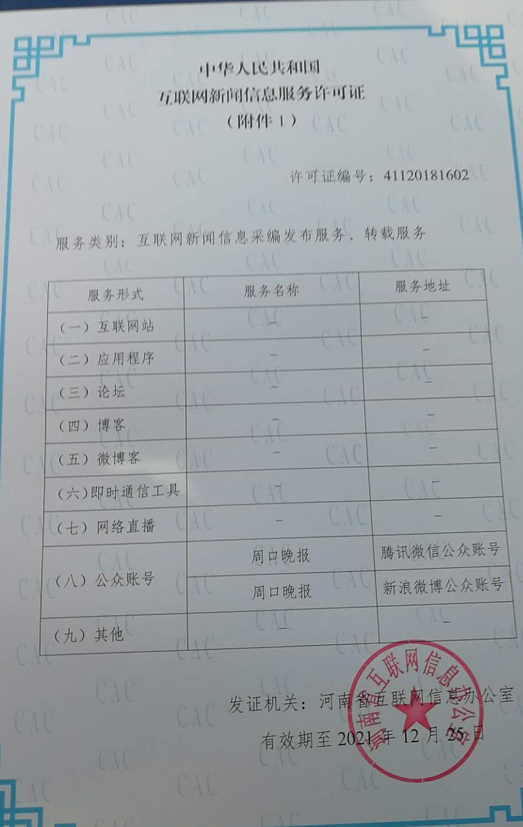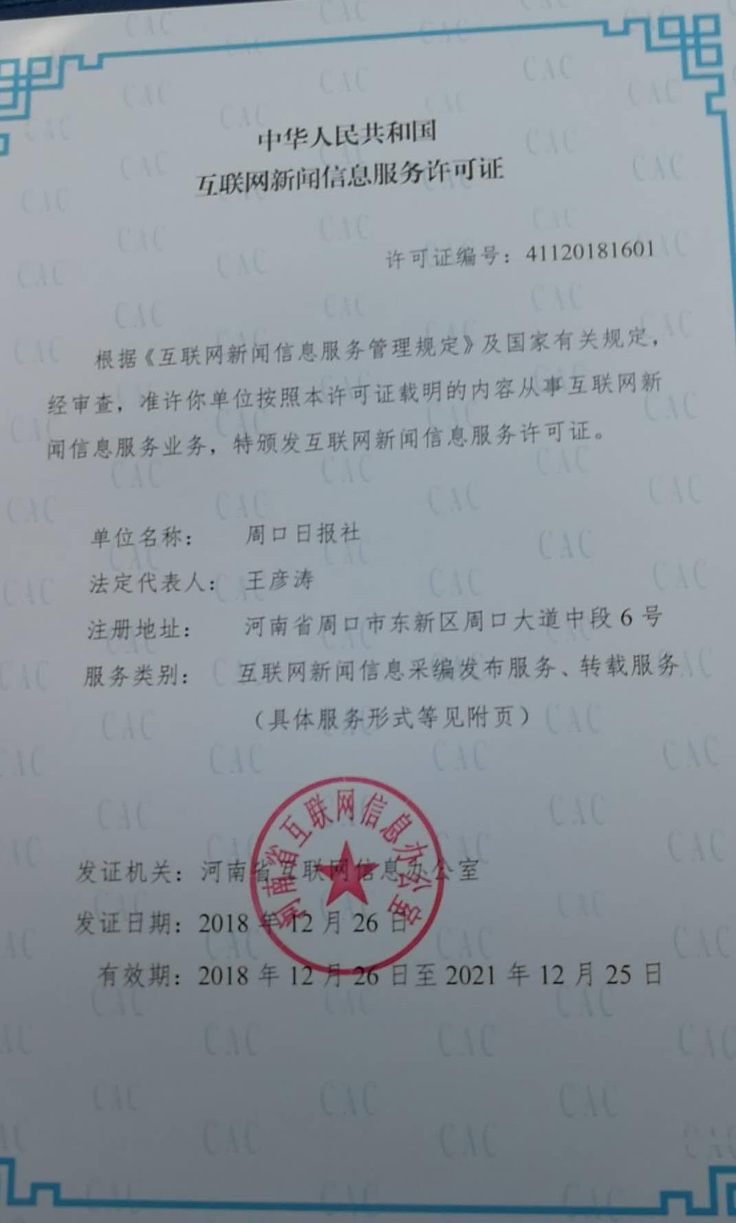 河南省互联网信息办公室自2017年9月开始开展全省互联网新闻信息服务许可工作,截至2018年12月26日,河南日报等41家单位获得互联网新闻信息服务许可,周口报业传媒集团独占两家,其中,周口日报社下属的中华龙都网、新周口客户端、周口日报微信公众号、周口日报新浪微博、中华龙都网新浪微博,以及周口晚报社下属的周口晚报微信公众号、周口晚报新浪微博均获得批准。