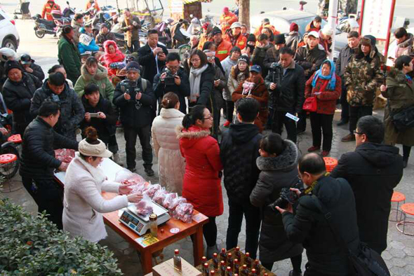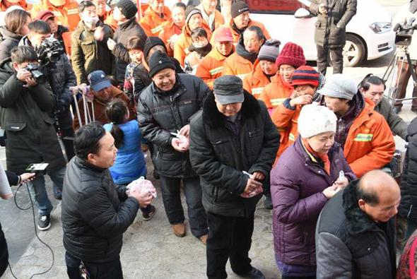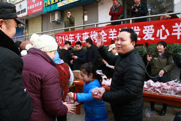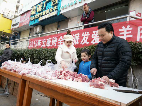 小小烧烤店门前,成了倡导“爱与奉献主会场”。 2019年1月1日上午10点,新年第一天,郑州市国基路与丰庆路交叉口太康烤全羊店门口,60多名环卫工、残疾人、困难群众等弱势群体聚集在这里,排队免费领取“羊肉哥”孙合理和妻子刘晓爱派送的一份新年礼物——爱心羊肉,而这爱举从2010年元旦开始到如今,已经坚持了9年。
