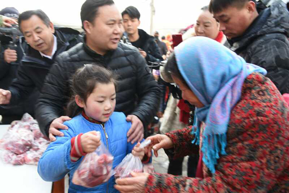 “羊肉哥”名叫孙合理,是周口市太康县高朗乡孙庄村人,自幼因母亲身体残疾,吃乡亲们的“百家饭”长大成人。10年前来到郑州,以卖烤羊肉串谋生,因心存感恩,多年来主动关爱环卫工、残疾人,免费为他们送羊肉。他热心公益奉献的事迹经多家媒体陆续报道,人送美誉“羊肉哥”。 当天上午10点许,“羊肉哥”夫妇俩将一袋一斤重的优质羊肉送出,女儿小梦露也忙前忙后,领取到新年礼物的每一个人都心存感激,无不竖起大拇指称赞。“羊肉哥”孙合理夫妇表示,只要他们的烧烤店存在,每年元旦派发爱心羊肉的活动就将继续进行下去。