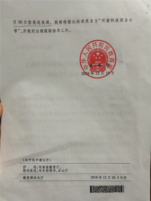 复函还表示,请河南省于2019年5月中旬组织对该校进行测评指导后,将测评报告报送教育部,教育部将据此批准更名为“河南科技职业大学”。