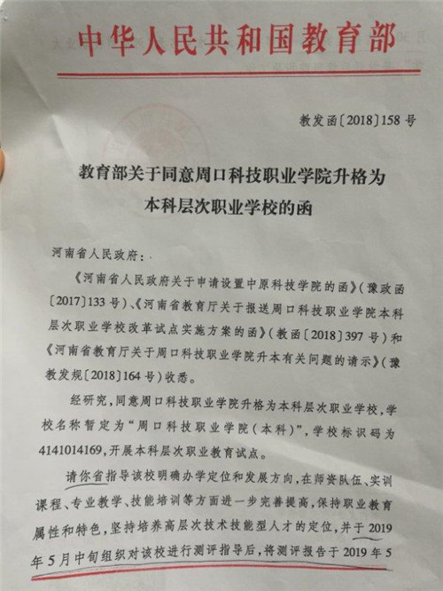 教育部的复函表示,经研究,同意周口科技职业学院升格为本科层次职业学校;请河南省政府指导该校明确办学定位和发展方向,在师资队伍、实训课程、专业教学、技能培训等方面进一步完善提高,保持职业教育属性和特色,坚持培养高层次技术技能型人才的定位。