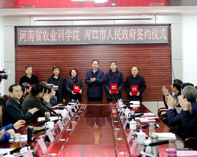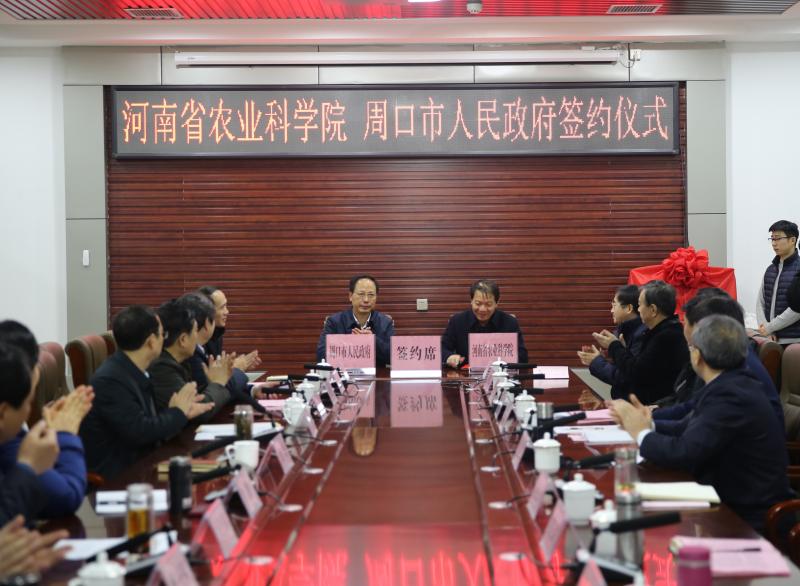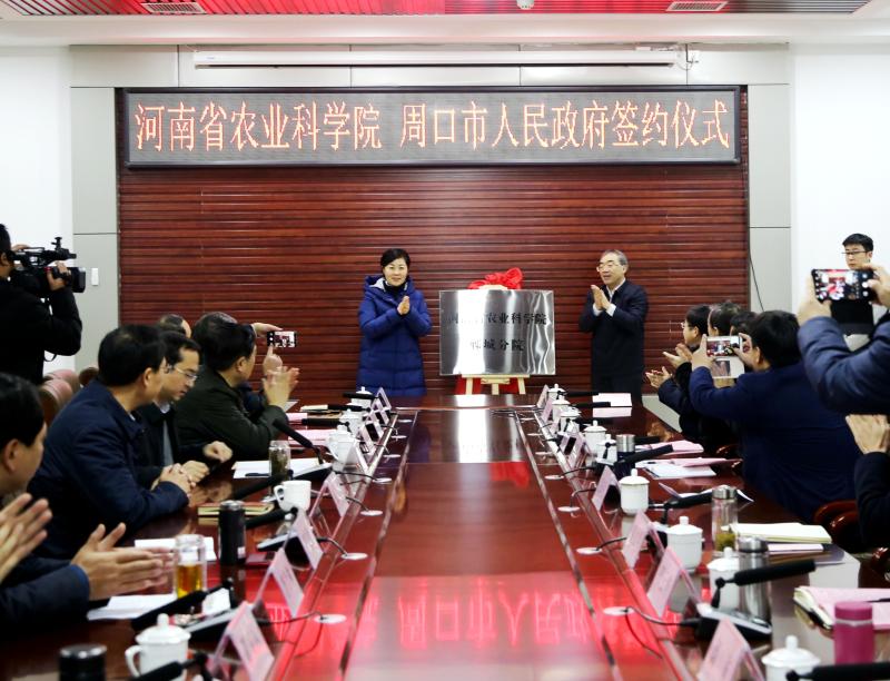 1月9日,河南省农业科学院与周口市人民政府签订全面战略合作协议暨河南省农业科学院郸城分院揭牌仪式在郸城举行,中国工程院院士、省农科院院长张新友,省农科院副院长卫文星,副市长张广东,以及郸城县委书记罗文阁、县长李全林等相关负责同志参加仪式。