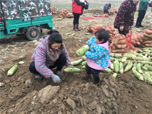 走在淮阳县刘振屯乡张老家村的田间地头,记者看见刘玉梅正将萝卜从地里扒出来装车,她的小侄女也帮起忙来,吃力地抱起了一个大萝卜。 记者 王凯 摄