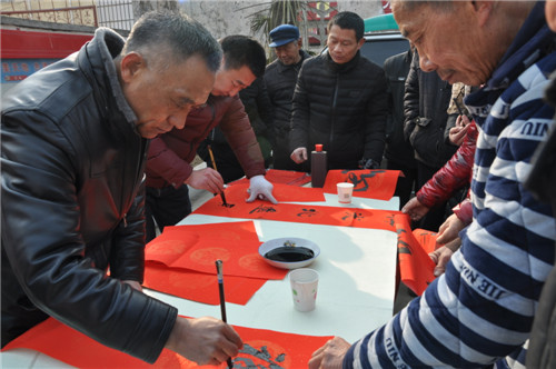 “我刚搬新家,要副大的对联!”1月20日,在商水县汤庄乡西口村文化大院义写春 联现场,刘丽挤在人群着高声对埋头写字的书法老师说。当天,商水县科协、汤庄乡 政府联合主办的“快乐星期天”暨“道德模范”表彰大会在这里举行。