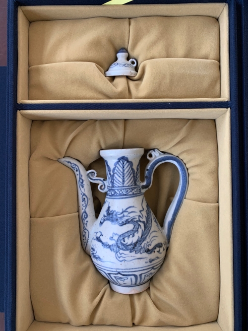 记者注意到,这件海捞元代青花瓷器,保存完整,造型美观。瓷器中部绘有一条在云中翻飞的龙,口沿上部饰蕉叶纹,底部有莲瓣纹,器物完整,造型精美。据了解,“海捞瓷”是收藏市场上对于从海底打捞出水的瓷器的一种称谓,特指古代“海上丝绸之路”和“海上香瓷之路”开始以后,中国对外贸易途中,在南海海域触礁沉船所遗留的各类外销陶瓷。市博物馆馆长周建山介绍,在历史上,中国著名的瓷器就是经由“海上丝绸之路”销往各国,这些“海捞”不但具有文物历史价值,还反映中国人通过这条海上丝绸之路,走向世界各地的重要证据。