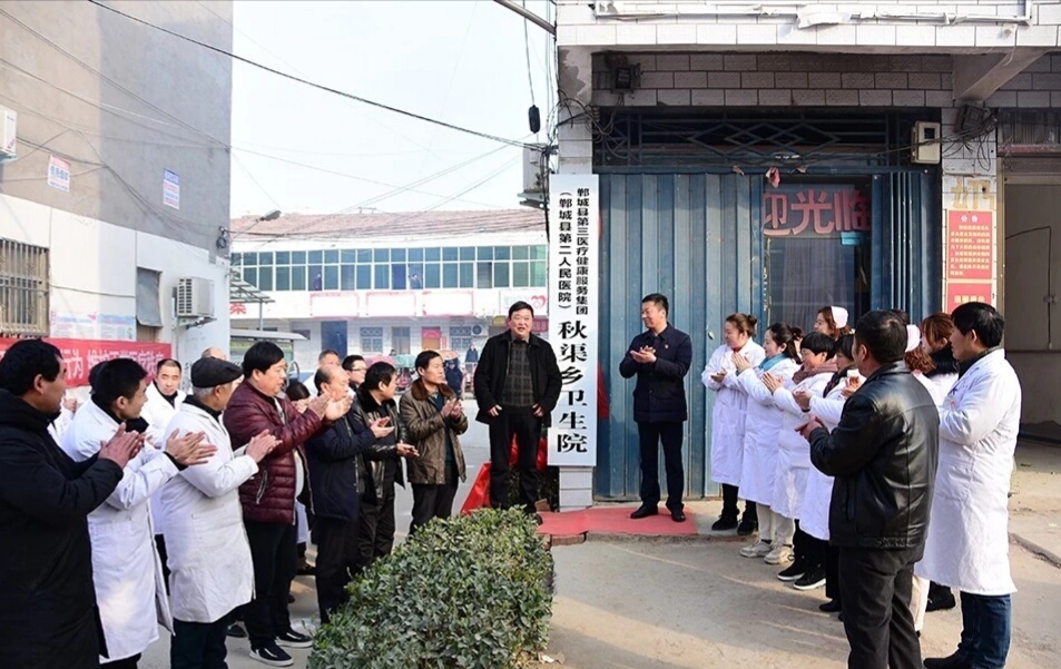 在秋渠乡卫生院,晋继忠与秋渠乡党委负责人梁辉为郸城县第三医疗健康服务集团(郸城县第二人民医院)秋渠乡卫生院揭牌。