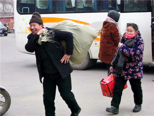 男男女女老老少少,带着大包小包的年货,急切而快乐地回家过年。