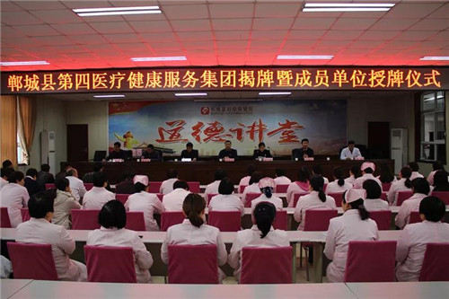 1月30日,郸城县第四医疗健康服务集团揭牌暨成员单位授牌仪式,在该集团牵头医院郸城县妇幼保健院会议室举行。县卫计委党组书记、主任付登霄,副主任黄玉珍、刘清俊,办公室主任杨光贞,郸城县第四医疗健康服务集团理事长、县妇幼保健院院长亢国良,副院长杨军、王斌出席仪式,并为第四医疗健康服务集团揭牌,为第四医疗健康服务集团其他成员单位授牌。黄玉珍主持仪式。