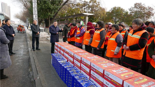 慰问中,皇甫立新、刘国庆一行首先来到新区“三公开”广场,慰问坚守一线的环卫工人,向他们致以新春的祝福,并对他们在过去一年里付出的辛勤劳动表示衷心感谢。皇甫立新指出,一年来,环卫工人们起早贪黑、兢兢业业,为改善居民生活环境和提升城市形象付出很多心血和汗水,取得了良好效果,城区环境和城市面貌有了很大改善,得到了社会各界的一致好评,希望环卫工人们在春节期间继续发扬奉献精神,把县城卫生打造的更加干净、整洁,让广大市民和回家过年的群众能深刻感受到县城环境的新变化,过一个干净舒适愉快的春节。