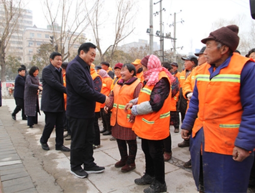 在谢安路和财鑫路交叉口,李锡勇对环卫工人说,马上要过春节了,这段时间是广大在外务工人员集中返乡的时间,路面上人多车多垃圾多,这也是环卫工人一年当中最繁忙、最辛苦的时候。我代表县委、县政府向你们及全县所有环卫工人致以节日的祝贺和崇高的敬意!