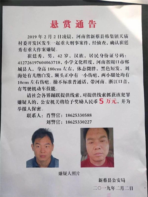 2月2日凌晨,驻马店新蔡县韩集镇发生一起重大刑事案件,犯罪嫌疑人崔某因怀疑其妻子与受害人杨某有不正当关系,午夜驾车冲进受害人杨某的居住地放火将其杀害,犯罪嫌疑人崔某趁夜色潜逃。新蔡县公安局党委启动重大刑事案件侦破机制,紧急发布公安协查通报,请求兄弟单位协助抓捕。并发布悬赏通告,悬赏5万元通缉崔某。结合犯罪嫌疑人崔某可能逃跑路线,新蔡警方先后辗转温州、青岛、临泉、周口等地开展抓捕工作,均未果。