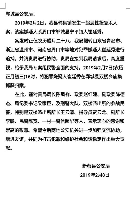 2月7日,在郸城县公安局局长陈凤祥,政委赵红建,党委委员、纪委书记梁家臣的指挥下,郸城县公安局双楼派出所经过多日连续工作,成功将驻马店新蔡县“2019.2.2”重大刑事案件犯罪嫌疑人崔某抓获。
