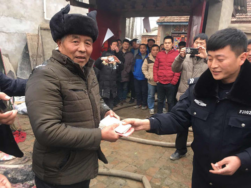 2月17日下午3时许,郸城县南丰镇徐寨行政村徐大庄一村民使用地锅后忘记灭火发生火灾,郸城县公安局一村一警张振伟冒险进入火中,帮助转移出1万元现金和重要证件。