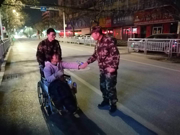 人民军队爱人民,无论山高水远,岁暮天寒。2月18日凌晨1时许,武警周口支队政委韩伟锋查勤归来,在支队大门口恰巧遇到一位大姐独自一人摇着轮椅艰难前行。当晚气象局预报有降雪,实时气温也只有-4℃。夜深人静,天凝地闭,韩政委有些担忧这位大姐的安全,连忙上前询问情况,并步行推着轮椅将大姐送至目的地。其实,这件事只是武警周口支队爱民助民工作的一个缩影。