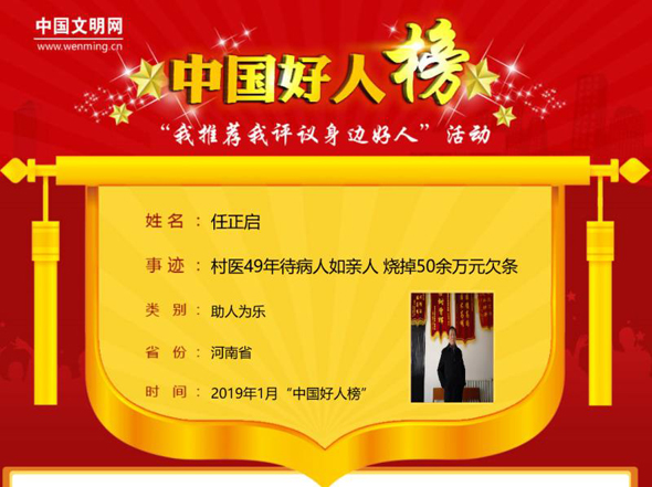 太康县马头镇任庄村村医任正启,待病人如亲人,用脚步丈量任庄村周边的每寸土地,他49年烧掉50余万元贫困户看病欠条。2月25日,中国文明网发布消息:任正启荣登2019年1月“助人为乐类”“中国好人榜”。
