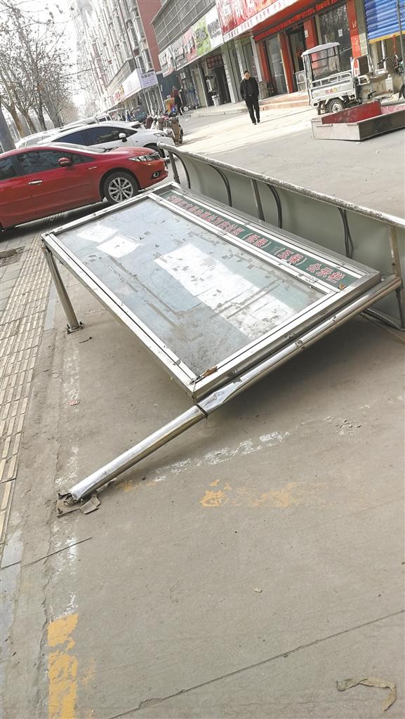 2月25日,在周口中心城区庆丰路与周口大道交叉口西侧,一个公示栏因两根支柱被撞坏而倒在地上。记者希望有关部门及时整修,让市容市貌越来越好。