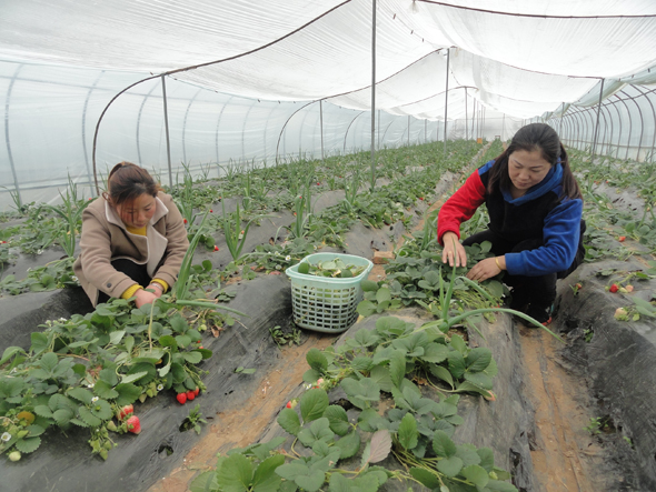 2月27日,商水县邓城镇返乡创业标兵、镇人大代表冯杰(右)对草莓进行疏叶管理。冯杰在镇人大、工商联帮助下创办了生态葡萄园,并种植了温室草莓,安排了50名贫困户就业。