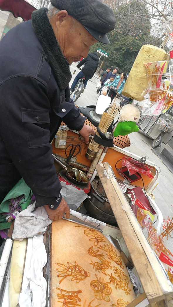 以糖稀为原料制作一幅糖画,只需要1分多钟。昨日,记者在中心城区七一路与六一路交叉口附近,目睹了闫先生制作糖画的过程。闫先生以糖稀为原料制作的小动物惟妙惟肖,还有“福”“爱”等字。闫先生告诉记者,他是周口本地人,制作糖画已30多年。记者 关秋丽 摄