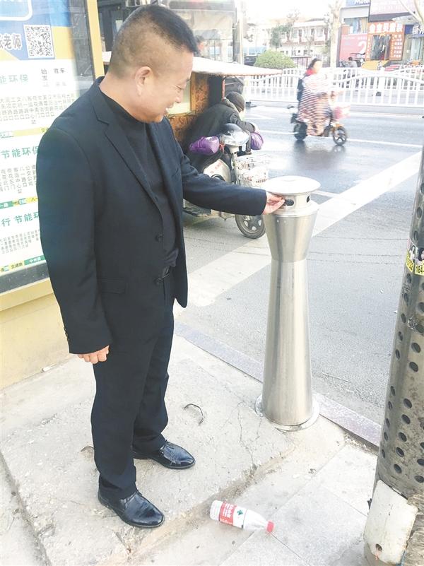 3月12日,一位市民把烟头扔进原荷花市场北门公交站牌附近的烟头收集器。