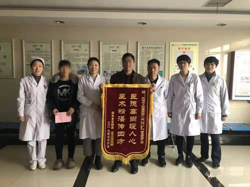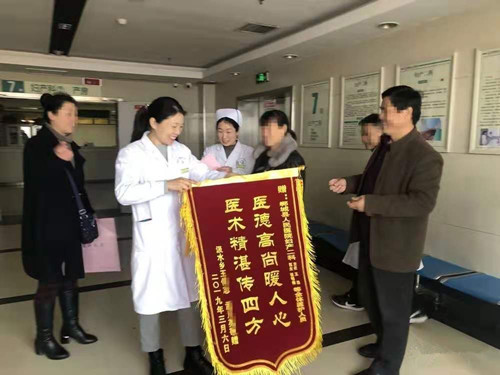 术后患者恢复良好,康复出院后,3月6日上午,患者和丈夫一起来到医院,向住院期间给予了精准治疗和细心护理的妇产二科王皓主任、张明伟医生及全体医护人员赠送锦旗,以表谢意。
