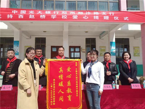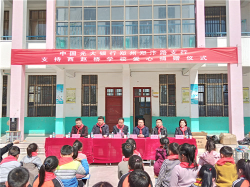 3月14日上午,阳光明媚,春意盎然。中国光大银行郑州郑汴路支行向商水县汤庄乡赵桥学校爱心捐赠仪式在赵桥学校内举行。河南省委组织部驻西赵桥村第一书记杨永,商水县教体局负责人郑春来、汤庄乡党委书记潘建甫等出席捐赠仪式。