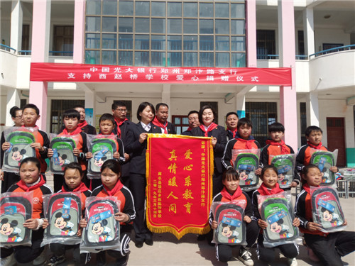 捐赠仪式上,郑汴路支行行长苗长海一行向赵桥学校捐赠文具袋50只、书包50个、跳绳50根、板球拍50对、热水袋50只、围巾50只、跳棋50盒、沙包200个。苗长海表示,光大银行郑州郑汴路支行会一如既往的积极响应党中央脱贫攻坚的重大部署,与省、市、县、乡结合继续开展形式多样的爱心扶贫等公益活动。他希望赵桥学校要运用好捐赠的学习、生活、体育用品,同时勉励孩子们一定要好好学习、将来回报社会各界的关爱和支持。