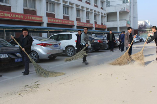 清除局机关办公区卫生,只是郸城县教育系统蓝天保卫战的一个侧面。教体局要求全县教育系统,自4月1日起,各乡校要彻底清洁校园,每周一次打扫,每天都要保持。有食堂的学校,特别是城区学校,要安装油烟净化器,把油烟排放降到最低。全县所有在建项目都要达到环保施工要求,所在学校校长抓好督促落实。要养成环保习惯,坚决不露天焚烧树叶、秸秆和垃圾,坚决不燃放鞭炮;多骑车、少开车,提倡绿色出行;积极举报冒烟、扬尘等产生污染的行为。要通过手抄报、主题班会、国旗下讲话等多种形式,大力宣传蓝天保卫战的意义和措施,指导师生主动“应战”,引导家长积极“参战”,在全社会形成“从我做起,从小事做起,人人为改善空气质量出力”的良好氛围,让郸城的天更蓝、水更清,校园更生态。
