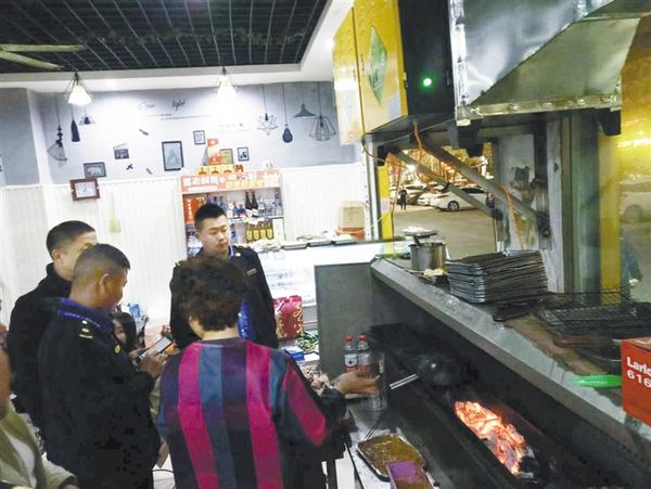 城管队员夜查餐馆餐饮油烟净化设备安装使用情况。