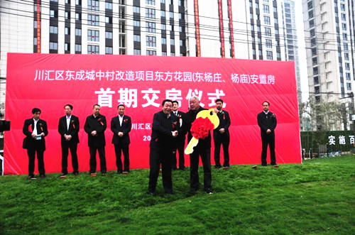 “真没想到,我们能住上这么高大上的小区!”4月28日上午,在川汇区东成城中村改造项目东方花园(东杨庄、杨庙)安置房首批交房仪式上,七一路办事处东杨庄村村民孟改正笑容满面地从区委书记李宗喜手中接过了新房的“金钥匙”。这是中心城区实施大棚改工程以来,川汇区交付的第一个正式安置房项目,标志着该区安置房建设进入了交房时代。